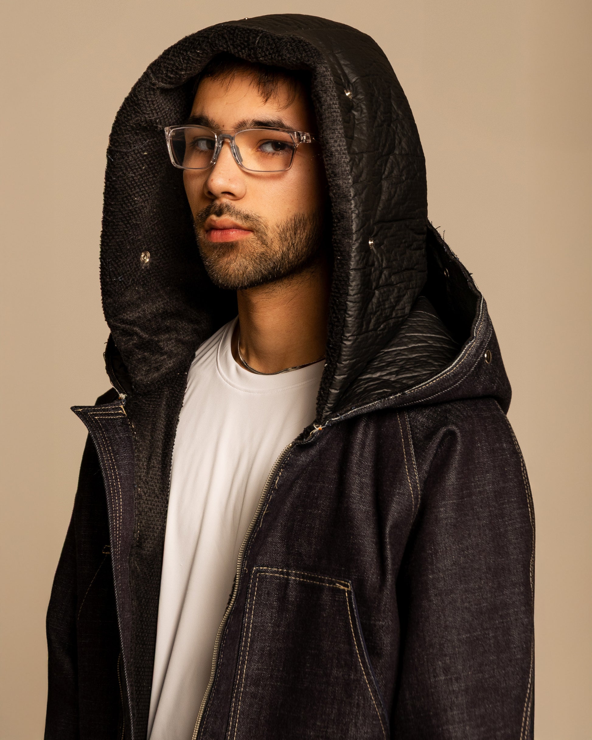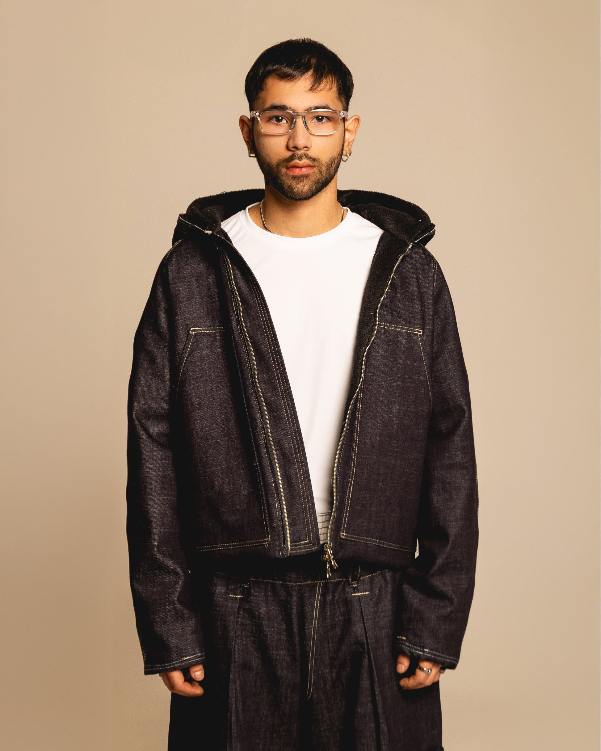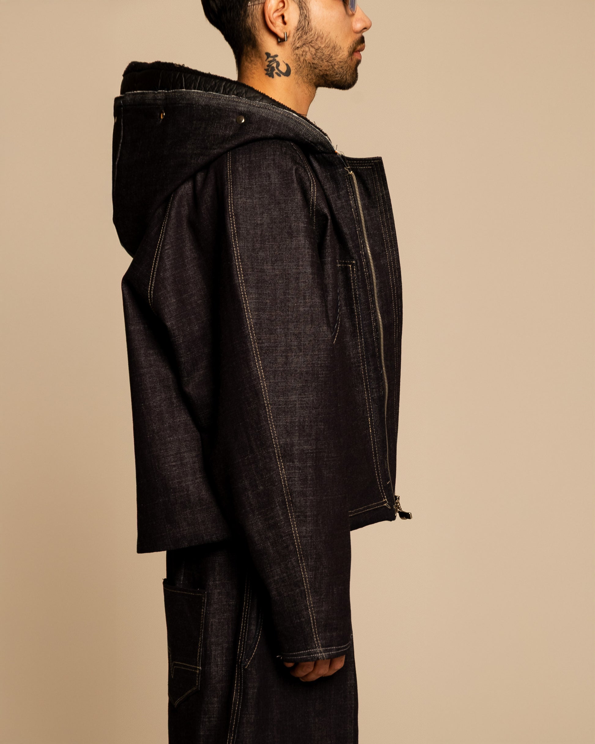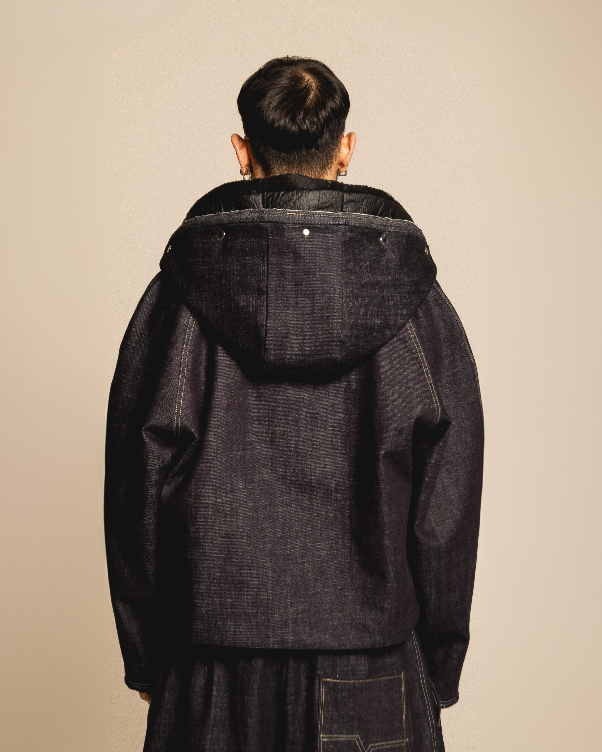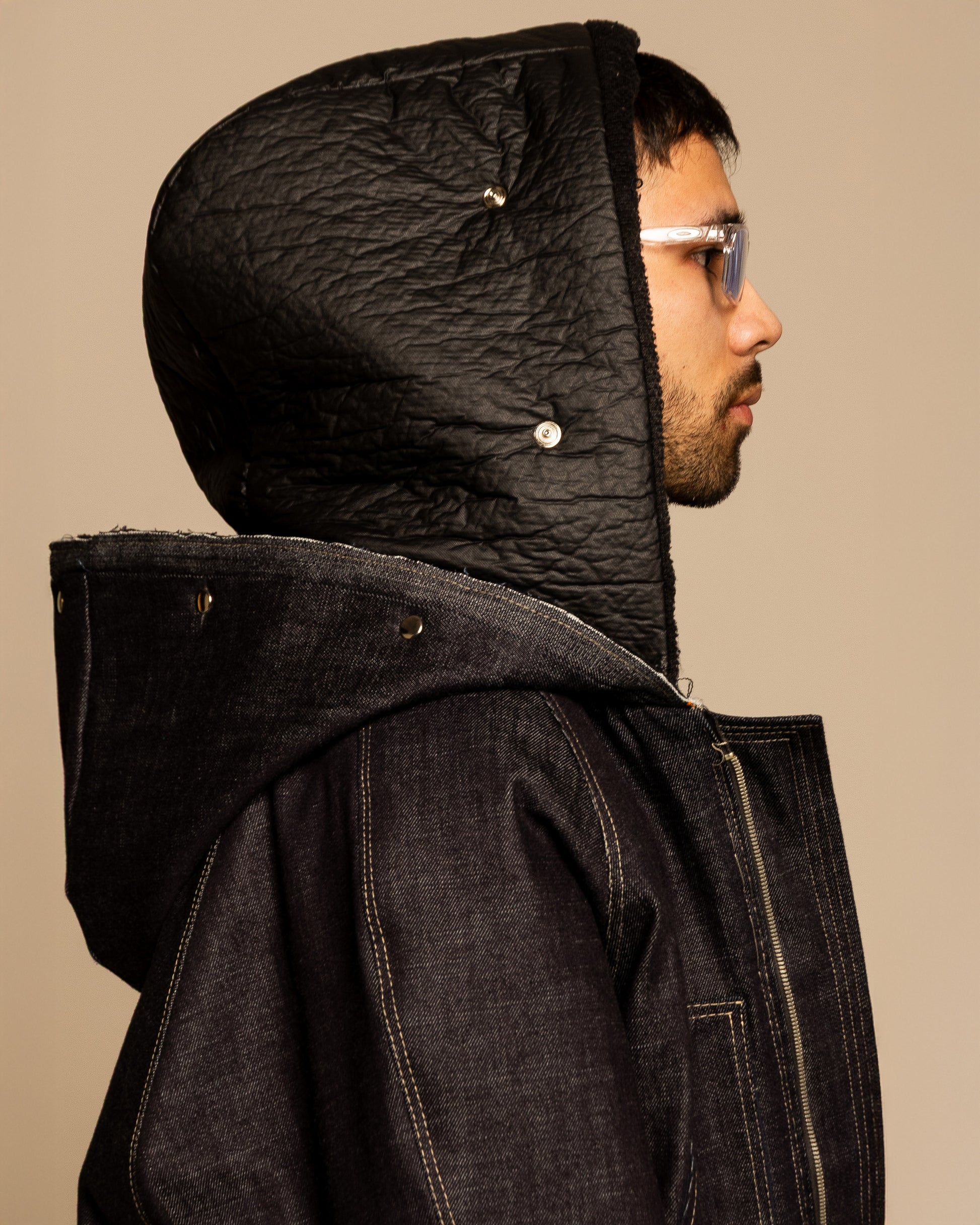 Realizzata a mano in robusto denim con una comoda vestibilità oversize e una calda imbottitura interna, questa giacca è perfetta per le mezze stagioni e l'inverno mite. Il suo design a doppio cappuccio può essere indossato separatamente o unito tramite bottoni per una silhouette unica.
